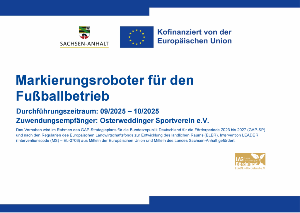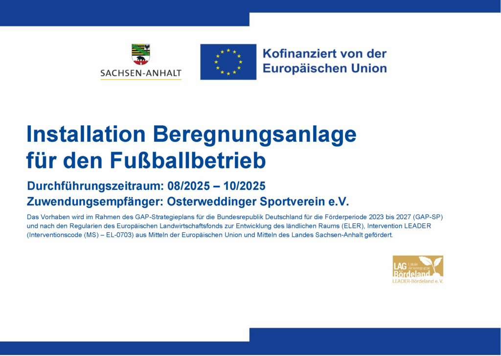 Im Rahmen des GAP-Strategieplans für die Bundesrepublik Deutschland für die Förderperiode 2023 bis 2027 (GAP-SP) und nach den Regularien des Europäischen Landwirtschaftsfonds zur Entwicklung des ländlichen Raums (ELER), Intervention LEADER (Interventionscode (MS) – EL-0703) aus Mitteln der Europäischen Union und Mitteln des Landes Sachsen-Anhalt wurde eine Ballfanganlage und ein Beschallungssystem gefördert. Wir bedanken uns bei allen beteiligten für ihre Unterstützung.